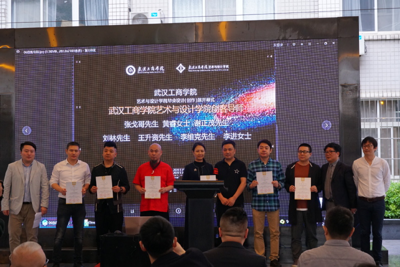 许开强教授与王海文院长向汉口二厂汽水联合创始人、利器广告总经理谢正茂,湖北为零广告董事长、马它它品牌联合创始人刘林,武汉文创会主席黄睿,武汉精一佳印务有限公司董事长王升资,中电杉帝(武汉)智造科技有限公司总经理李维克,武汉城投文化产业投资发展有限公司策划部部长李进,湖北省策划行业协会会长张戈哥,颁发了创客导师证书。