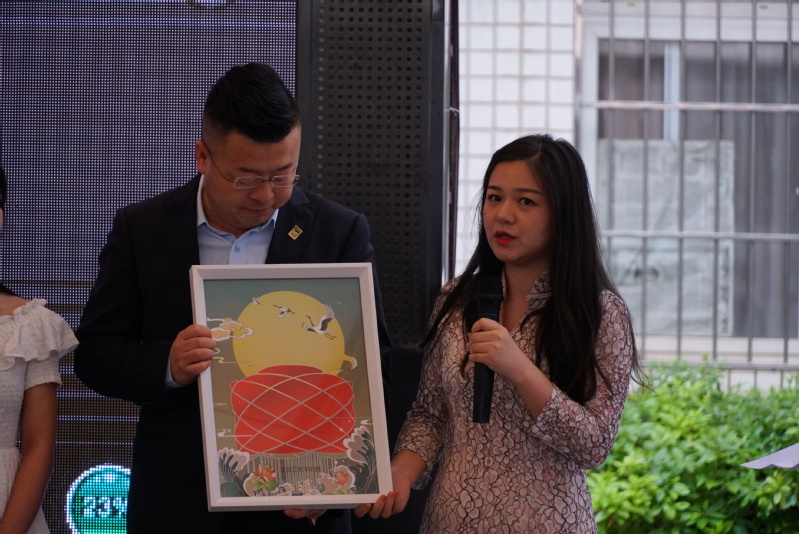 程奇老师与邱岚茜同学向特聘教授温浩先生赠送了学生工作室特别绘制的“汉秀红灯笼”吉祥礼物。