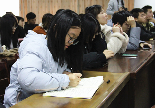 图为讲座现场学生认真记笔记 摄影:冯哲昊