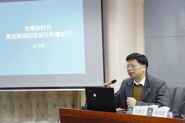 讲座伊始,赵代君主任便强调了宣传工作的重要性,他结合习近平总书记在去年全国宣传思想工作会议上做的重要讲话精神指出,在新形势下,新闻工作者要自觉承担起举旗帜、聚民心、育新人、兴文化、展形象的使命任务,坚持正确的政治方向,同时要不断锻炼自身亲身求证的脚力、管中窥豹的眼力、严谨缜密的脑力、行云流水的笔力。