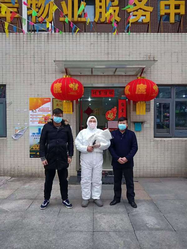 图为 陈成(中间)向校区物业捐赠物资2020.2.2