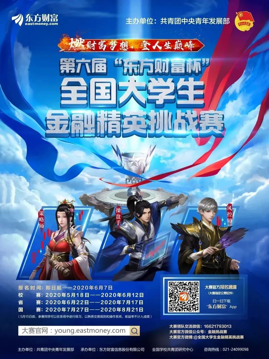 由共青团中央青年发展部主办的第六届“东方财富杯”全国大学生金融精英挑战赛,旨在深入学习宣传贯彻习近平新时代中国特色社会主义思想和党的十九大精神,搭建金融界产学研交流合作平台,帮助大学生掌握金融基础和知识,提升创新创业能力,增强金融安全意识以及完善就业创业素质。