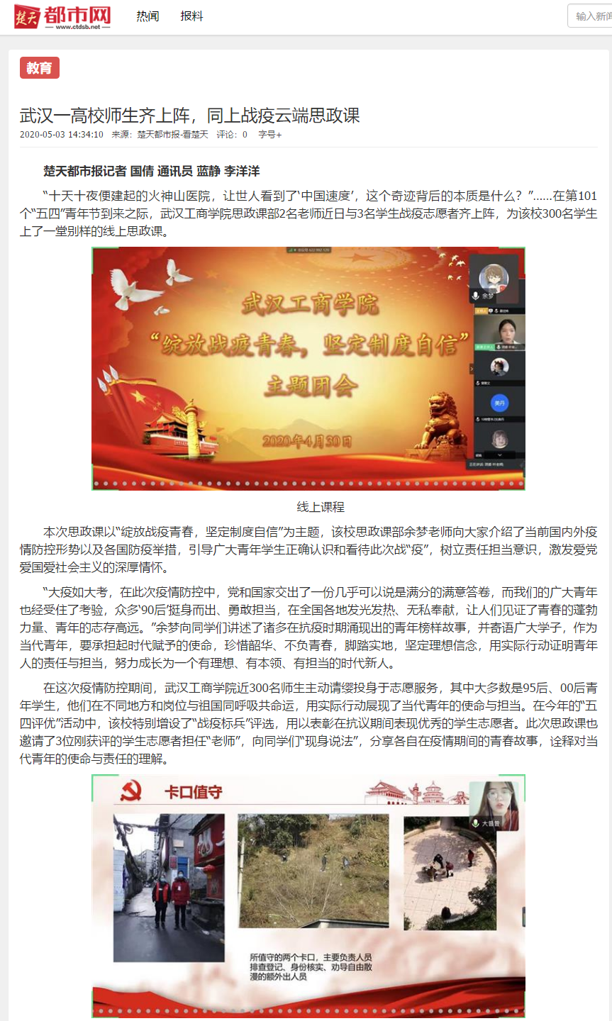中国教育在线、今日头条、楚天都市报报道我校云端思政课截图