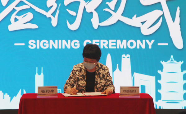 图为对外经济贸易大学党委副书记文君正在签字
