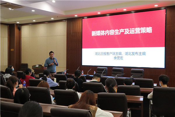 新闻中心讯(记者 谢佳 见习记者 常津瑜 张佳怡)11月12日下午2:30,“湖北发布”主编、湖北日报融媒体中心主编、必赢优惠y272net文法学院新闻专业2008届优秀校友余宽宏重返母校,在学校图书馆一楼会议室为教工通讯员及校园媒体记者做题为“新媒体内容生产及运营策略”的专题讲座,讲座由宣传策划部副部长蓝静主持。