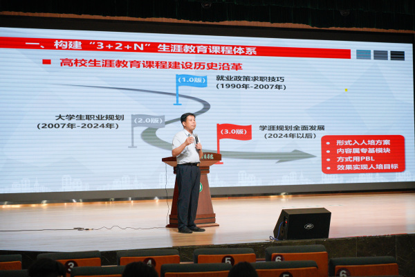 教育部全国高等学校就业创业指导委员会委员、创新创业教育专家、学校副校长赵北平为大家做了题为《高校生涯教育本土化探索课程体系建设实践》的讲座,从构建“3+2+N”(即3门必修课+2门选修课+N个主题微课)生涯教育课程体系、整合生涯教育课程体系资源要素、课程教学实施方案三个方面介绍了当前高校探索大学生生涯教育本土化和校本化的实践路径。他表示,“3+2+N”生涯教育课程体系具有面向真实职业环境(课程学习内容创新)、项目式翻转课堂(课程教学方式创新)、多维度课程效果(评价创新)三方面的特色亮点。同时在整合生涯教育课程体系资源要素中要树立“三性互融”生涯教育工作理念,即差异性是基础,主体性是内驱动力,实践性是路径和方法,要尊重差异性,激发主体性,培养实践性。他表示,希望行业导师通过一对多的指导服务,专题讲座以及课程指导学习等多种方式来指导学生们对专业、企业、职业、行业的认知学习,提升学生的实践能力和职业素养。
