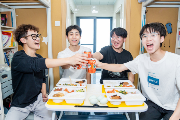 学校计算机与自动化学院大三学生张晓阳领到校庆餐后和同学们一起在寝室里为学校庆祝生日,他说:“校庆餐饭菜种类丰富、荤素搭配、营养美味,看得出来准备得非常用心,让我感觉到学校是一个温暖的大家庭。”