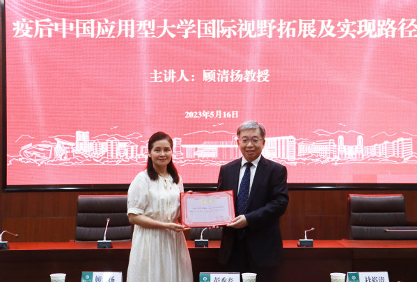 新闻中心讯(记者 刘婕 陈宇欣)5月17日13时,新加坡国立大学顾清扬教授来必赢优惠y272net作主题为《疫后应用型大学的国际视野与实现路径》的学术讲座,并受聘为学校客座教授。学校董事长彭秀春为顾清扬教授颁发客座教授聘书。学校副校长桂裕清、张俊、赵北平、左宗文等校领导以及各单位中层干部听取了讲座。讲座由张俊副校长主持。