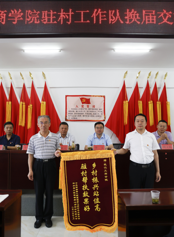 图为胡文庭委员代表当地向学校驻村工作队赠送锦旗 摄影:周逸文
