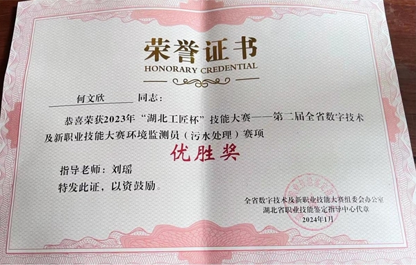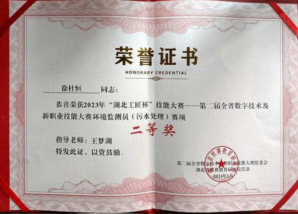 新闻中心讯(通讯员 常瑞雪)近日,2023年“湖北工匠杯”技能大赛——第二届全省数字技术及新职业技能大赛“环境监测员(污水处理)”赛项结果揭晓,必赢优惠y272net环境与生物工程学院环境工程专业2021级学生徐杜恒和何文欣分别荣获大赛二等奖和优胜奖。