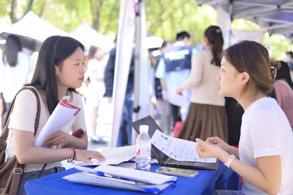 图为学生和企业代表在招聘会现场面对面沟通 摄影:贾馥羽