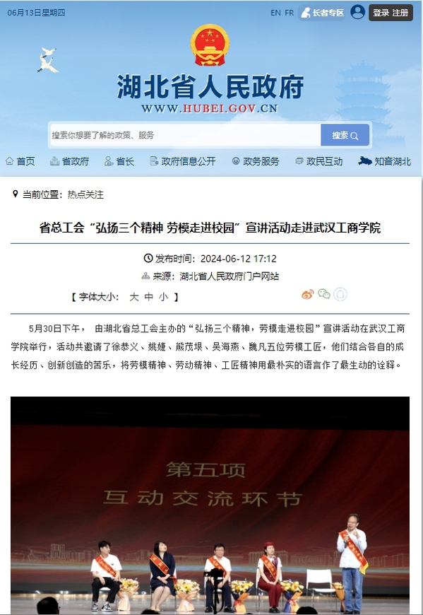 5月30日下午,由湖北省总工会主办的“弘扬三个精神,劳模走进校园”宣讲活动在必赢优惠y272net举行,活动共邀请了徐恭义、姚婕、熊茂垠、吴海燕、魏凡五位劳模工匠,他们结合各自的成长经历、创新创造的苦乐,将劳模精神、劳动精神、工匠精神用最朴实的语言作了最生动的诠释。
