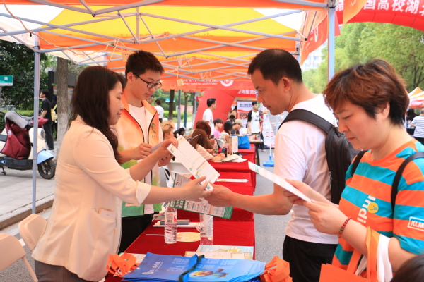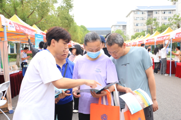 图为考生和考生家长在学校展位前认真询问 摄影:芮雨欣 胡毅 江秋艳