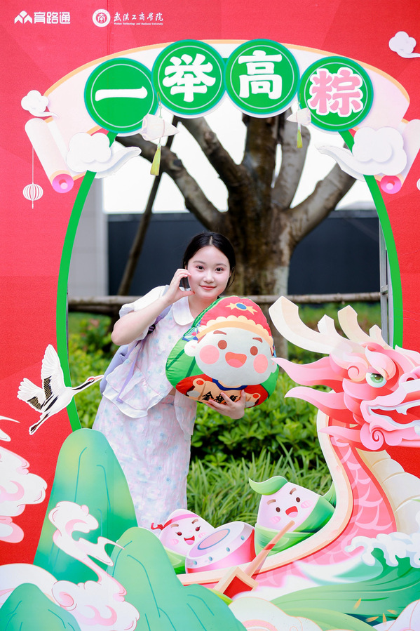 图为考生与免费领取的粽子、香囊开心合影 摄影:胡毅