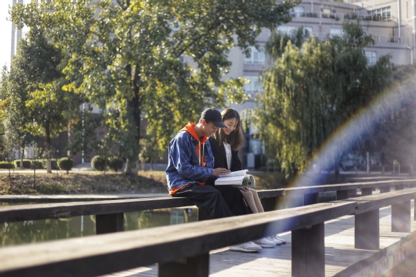 静思湖长椅上的你,捧着书,水映照着你