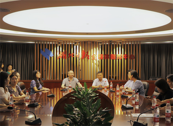 刘生元书记一行先后参观了荆楚网(湖北日报网)、楚天舆情数据研究院、湖北日报5G全媒体演播室、社史馆、编辑部、全媒体指挥中心等地,了解湖北日报全媒体运作的基本环境及运营模式。随后,与湖北日报编委、文化新闻中心主任孙国平,荆楚网董事长、总经理熊爱玲、调研员孔祥福、教育事业部主任黄培,湖北日报融媒体中心副主任唐晓煜,湖北日报广告经营中心地产商业事业部主编曹栗、湖北日报全媒体经营中心经济师周游、荆楚网舆情分析师熊露娟等开展座谈。其中,曹栗、周游、熊露娟均为学校文法学院校友。