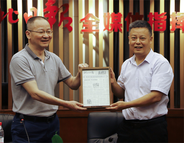 图为湖北日报编委、文化新闻中心主任孙国平向刘生元书记赠送生日报 摄影:王锦丰