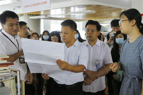 图为余宽宏向刘生元书记一行介绍湖北日报报纸 摄影:王锦丰