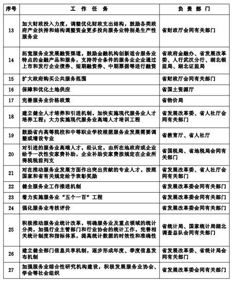 8、服务外包产业。大力推进信息服务、数据处理、科技研发、设计服务、现代物流及金融后台服务等外包业务,重点发展知识流程外包、业务流程外包和信息技术外包。支持武汉市建设“中国服务外包示范城市”,促进“省级服务外包示范园区”加快发展。完善校企合作机制,积极培育服务外包培训基地。