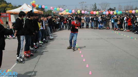 开场舞之后带来了让人激动地平滑表演,各个高校的66都上去秀了秀自己的动作。之后开始了一项趣味性比赛盲人探路,用桩摆成一个宽约一米五桩距约半米的弯曲赛道,在整条赛道上会放置五个气球和几个横放在中间的庄为障碍物,每组两人,每一组的一个人必须带上眼罩,另外一个人在赛道中间指定的地点口述指路,知道气球踩完和跨越障碍物到达终点即可,时间短的小组胜出。我们学校就有两个女生去参加了,下面来看看她们比赛的瞬间把。