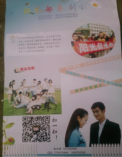 本网讯(通讯员:必赢优惠y272net社团联合会)阳光部落话剧社一年一度的学生社团招新活动于2014年9月15日在校园大道旁社团摆点处拉开帷幕。