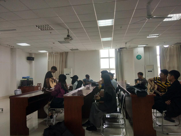 此次教学内容自然也不同,第一批成员依旧学习《平凡之路》这首歌,在上次的课程中已经熟悉并学习了这首歌的四个和弦,所以这次决定加深难度,学习后面的扫弦部分,扫弦需要扫出完好的节奏感,这对于成员们来说是一个巨大的挑战,有些人的节奏慢,有些人的节奏快,但是老师并没有为此感到烦躁,而是很有耐心的带着我们看着成员的手势,跟着成员的节奏慢慢打着拍子,在成员们自由练习时,老师也是对学员一个一个进行指导,确保每个人都能打到正确的拍子。对于第二批时间段的新成员,老师更是认真对待,依然从最简单的认弦识谱开始,虽然这对于老师来说很枯燥乏味,但是老师并没有敷衍了事,而是结合教老成员的经验,对新成员的教学进行了弥补与改善,使他们很容易接受和理解。此次教学活动很快就结束了,成员们都学到了或多或少的知识,有些成员甚至走的时候还不忘虚心请教,期待着下次教学早点来临。