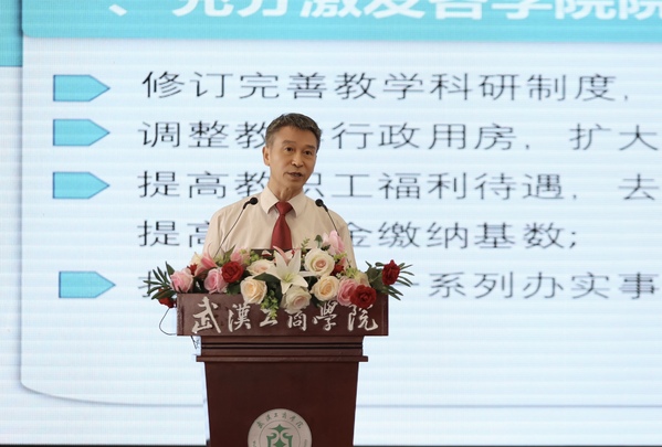 孔建益以“凝心聚力谱新篇 携手奋进向未来”为主题作了“学校2022年上半年工作总结与下半年重点工作布置”报告。他表示,上半年校行政、党委领导班子带领全体师生员工围绕“十四五”发展目标,聚人心、提士气、抢机遇、谋发展,有力推动了学校各项事业迈上新台阶。学校不仅采取了一系列的硬核举措着力推动构建武工商命运共同体,充分激发各学院院长和全体教职工的干事创业热情,打造“学在武工商”品牌效应,还在党建思政、学科专业建设、本科教育教学、科技创新与社会服务能力、人才强校战略、招生、就业创业、形象宣传、校庆工作和后勤保障工作等方面取得了可喜的成绩。