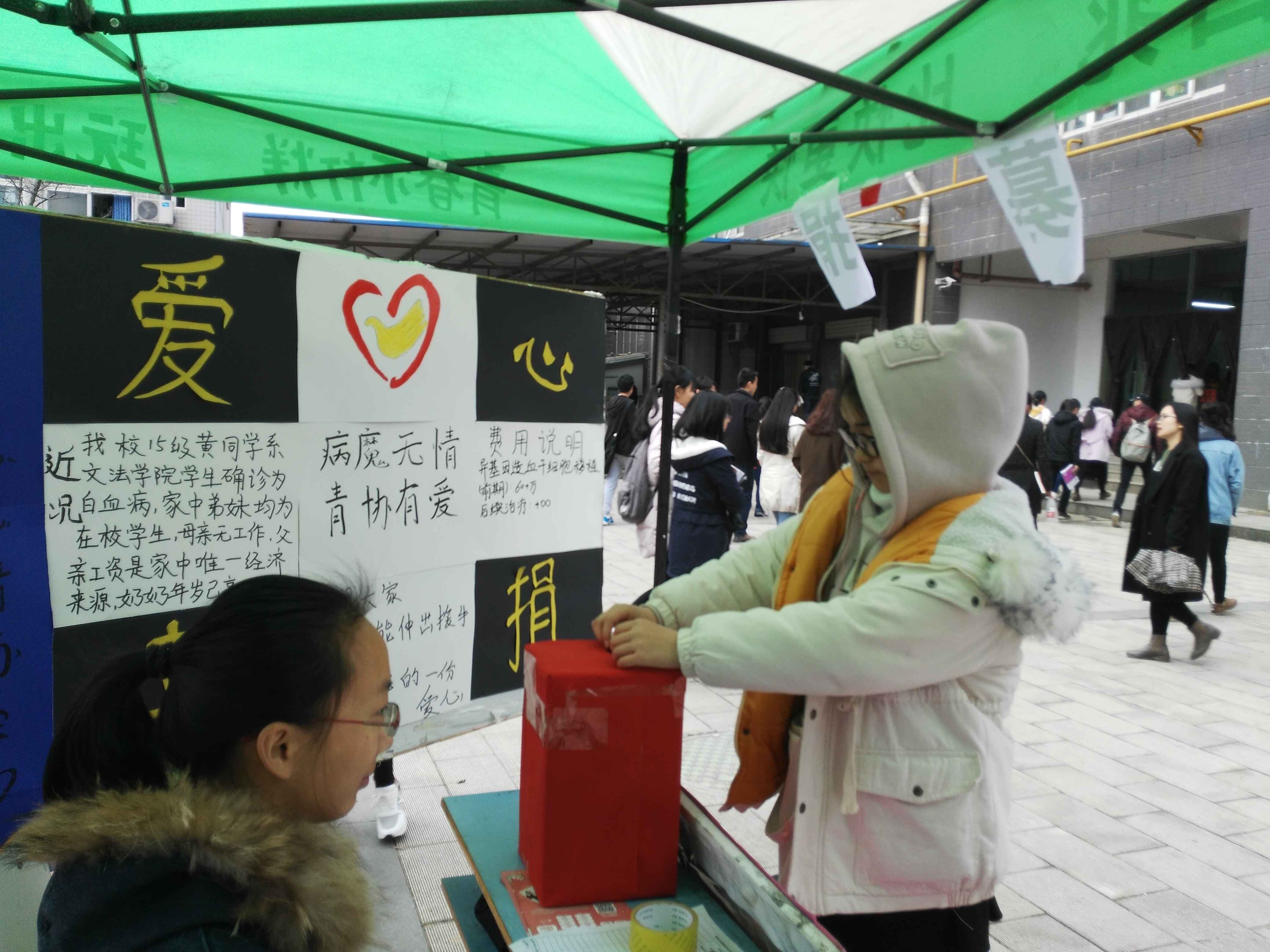 文法学院讯(通讯人 秦庆林) 感恩奉献,与爱同行,必赢优惠y272net3月15日为文法学院15级广告学生白血病患者举办了一场爱心募捐活动,各系部、团体组织、教职工以及广大同学们均积极参与其中。本次募捐活动是为了帮助一个身患疾病的同学筹到医疗费而举行的,全校师生秉承团结互助,爱心传播的美德,让这位同学感受到爱与力量,并且要让这位同学知道,不是她一个人在战斗,所有武汉工商工商学院全体师生都与她并肩作战!