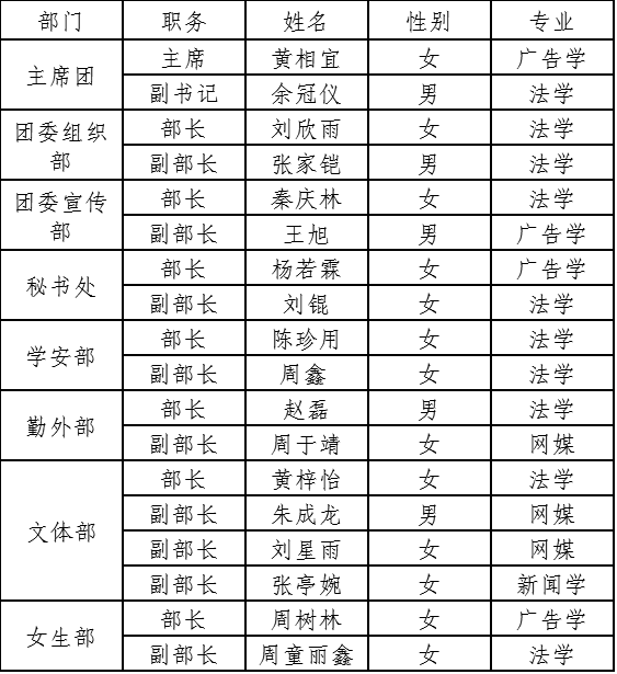 根据学院学生干部换届选拔、调整工作要求,本着公开、公正、公平的原则,经学生自主报名、组织推荐、资格审查、竞选面试、同时结合平时工作开展情况综合考察,拟选拔确定我院第五届院团委、学生会成员,现将名单公示如下: