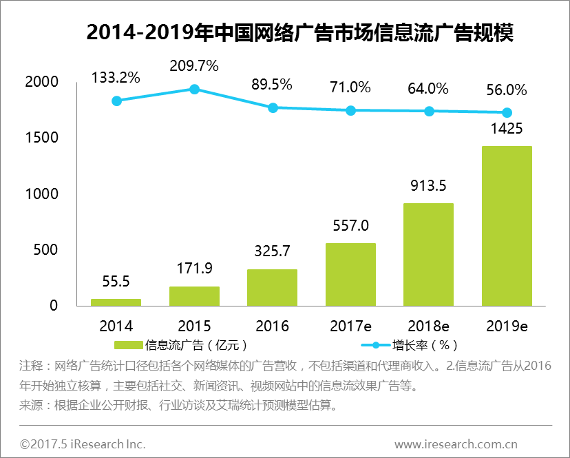 2016年中国信息流广告规模为325.7亿元,同比增长率为89.5%,预计未来三年仍将保持50%以上的增长,到2019年将突破1400亿元。此外,2016年热炒的网红概念、资本市场助推的直播平台等,都促进着网络广告的形式和创意不断变化,内生广告或也将成为未来的发展新趋势。