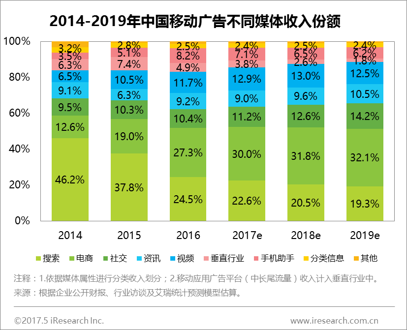 在移动广告方面,受新广告法影响,搜索类广告收入增速有所放缓,同时,随着用户对电商的依赖和使用行为的转移,移动端电商类广告收入持续保持较高速度增长,在整体移动广告市场中居首位,占比达27.3%,预计2017年将达30%。而社交类、视频类分别作为用户使用频率最高、用户使用时间最长的服务,通过原生广告、信息流广告等新兴广告形式,降低了广告对于用户体验的影响,并进一步开发了用户价值,未来仍会有较大的增长空间。此外,伴随着移动广告市场马太效应的增加,中长尾平台及流量对广告主的吸引降低,包括中长尾流量在内的垂直行业未来增长相对乏力。