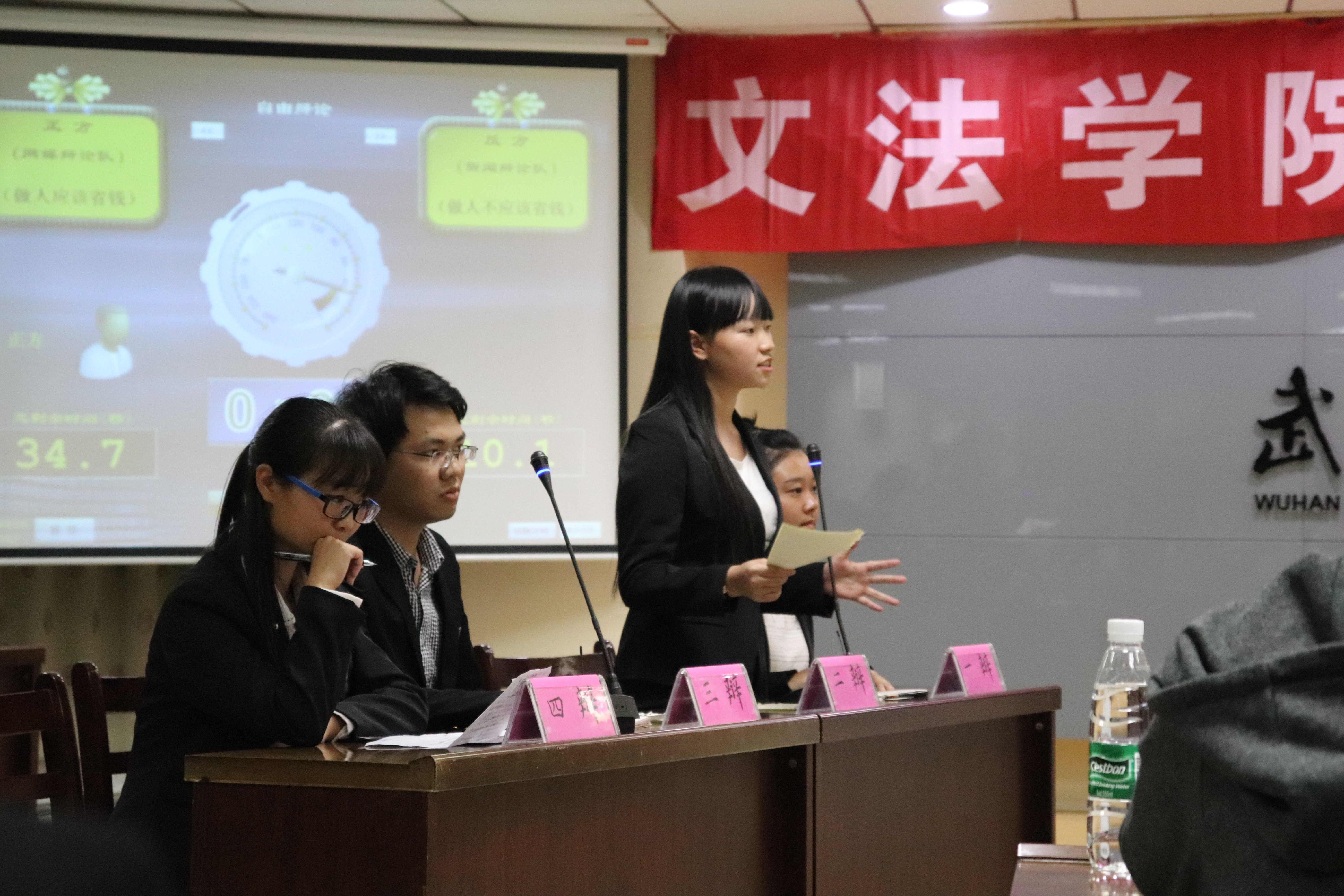 文法学院讯(通讯员 雷彬彬)为丰富我校学生课余生活,提高学生综合素质,为给具有辩论才华且爱好辩论的学生提供一个展示自我的舞台。2017年11月3日我校于综合楼十楼第三会议室举行群英辩论赛。 此次辩论赛通过抽签将文法学院四支专业代表队两两分组。第一组是网络与新媒体专业代表队与新闻学专业代表队,辩题为:“我们应不应该省钱?”;第二组是法学专业代表队和广告学专业代表队,辩题为:“我们需不需要超级英雄?”。通过两轮的唇枪舌战,正反两方代表队互不相让,妙语连珠。从开篇立论到总结陈词,从攻辩到自由辩论。在一次次你来我往中,辩手们语惊四座,现场掌声雷鸣。观赛学生热情参与,互动环节带动了现场气氛。最后,经过两轮激烈的交锋,由去年最佳辩手徐菁敏、演讲与辩论协会会长吴元龙等组成的评委团点评打分、学生会干事计分公布成绩。
