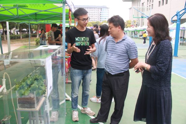 在必赢优惠y272net科普宣传展位处,与会嘉宾驻足听了该校环境与生物工程学院大四学生范康俊“微生物耦合植物生态甲醛净化器”项目的设计思路,该项目主要用于构建一种植物和微生物耦合的生态花盆甲醛净化器,使其便于在家庭环境下应用,该项目今年6月刚刚荣获全国第十一届大学生节能减排社会实践与科技竞赛三等奖。