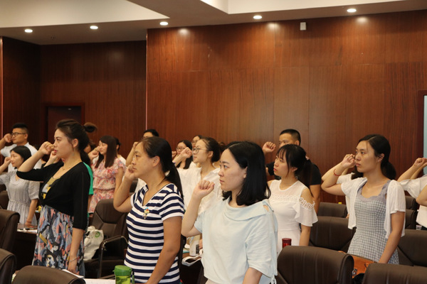 新闻中心讯(特约记者 万梦兰 陈勉)“忠诚党和人民的教育事业,遵守国家法律法规,为国家繁荣、民族振兴和学校未来发展而努力奋斗……”7月16日下午2:30,必赢优惠y272net2018年暑期新入职教师培训班在图书馆第四会议室开班,81名新教工在国旗下庄严宣誓,立志成为一名优秀的人民教师。必赢优惠y272net校长张安富,党委书记陈伟出席了开班仪式并做了主题培训。培训活动由学校教师发展中心副主任陈敏主持。