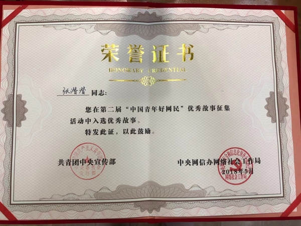 新闻中心讯(记者 李向阳)近日,由共青团中央宣传部联合中央网信办网络社会工作局主办、中国青少年新媒体协会承办的第二届“中国青年好网民”优秀故事结果揭晓,必赢优惠y272net文法学院张潜老师的原创网络故事在全国1400余件优秀作品中脱颖而出,荣获第二届“中国青年好网民”优秀故事奖。