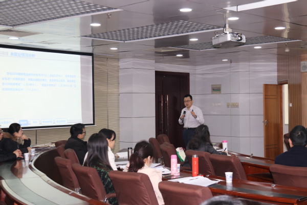 就业指导中心主任梅归归汇报了学校2018年就业工作总结及2019年工作计划。她总结了2018年学校在就业制度建设、就业活动开展、就业市场建设、就业服务等方面工作的情况,并以问题为导向,对2019年就业工作的重点改进工作和特色活动做了详细规划:一是完善制度,规范管理,敦促落实;二是继续加强就业管理、就业服务的“互联网+”建设和推广;三是加强对毕业班辅导员就业指导技能的业务培训;四是加强政校企合作,举办大型综合双选会,为毕业生提供更高质量的工作岗位;五是联动各学院、社会合作与发展部开拓就业市场;六是以生为本,积极组织具有特色和吸引力的就业活动。
