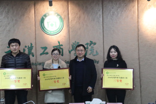 图为张俊副校长(右二)颁发“2018年度毕业生就业工作二等奖”