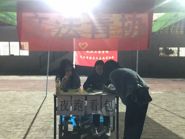 文法学院讯(通讯员 梅佳俊)为磨练坚强意志,顽强拼搏精神,我校学生自发组织夜跑活动,把奋斗与喜悦化作奔跑的动力,跑出自信,跑出激情。为了大力支持同学们的这一活动,保护同学们的随身物品,文法学院青年志愿者协会在3月11日正式启动义务看包活动。看包地点设在运动场看台,安全卫生,透明公开, 专人看守。文法青协派出干事,一班三到四人,全方位无死角守护。寄存物品的同学拥有专属号码牌。一人一牌,凭牌领物,安全系数高。服务时间为周一到周四19:00—20:30,尽最大可能为同学们服务。同学们在规定时间内凭号码牌领取自己的寄存物品,未被及时领取的由文法青协统一保管。