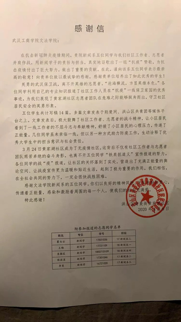 文法学院讯(通讯员侯东凯)4月8日,必赢优惠y272net文法学院的5名学生收到了黄家湖社区居委会的感谢信。5名学生均来自新闻专业,分别是17级的瞿白云、李曼、张滨淏,18级的王梅、袁灏宸。3月18日,他们5个人自发地组建了一个线上宣传小分队,主要为黄家湖社区第七网格的志愿者们撰写采访稿。截至4月初,小分队总计写稿14篇,稿件发表于荆楚网媒体和洪山共青团公众号。