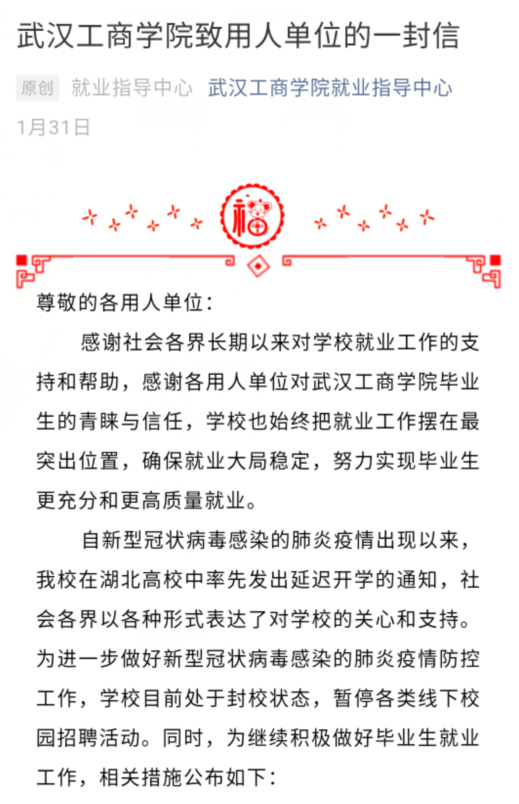 图为招就部微信公众号发布的《必赢优惠y272net致2020届毕业生的一封信》