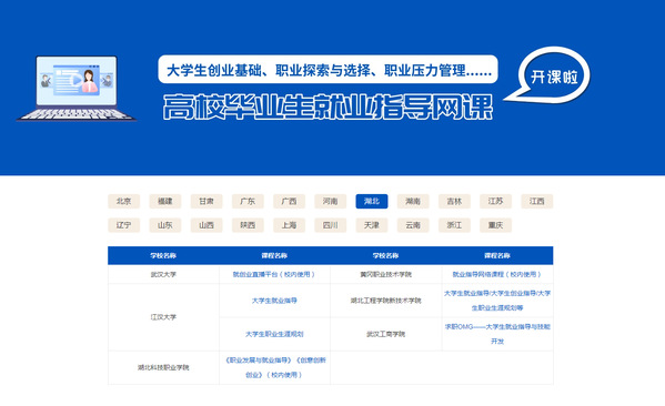 图为教育部网站公布的第一批湖北省高校开通的线上就业课程名单