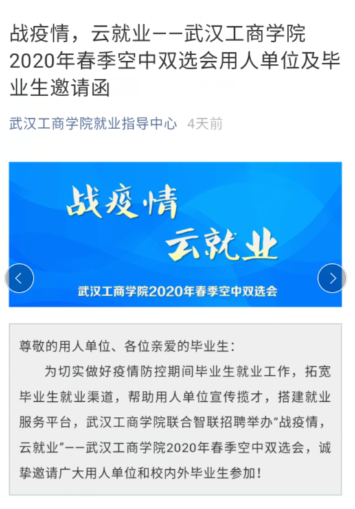 图为招就部微信公众号发布的《必赢优惠y272net致用人单位的一封信》