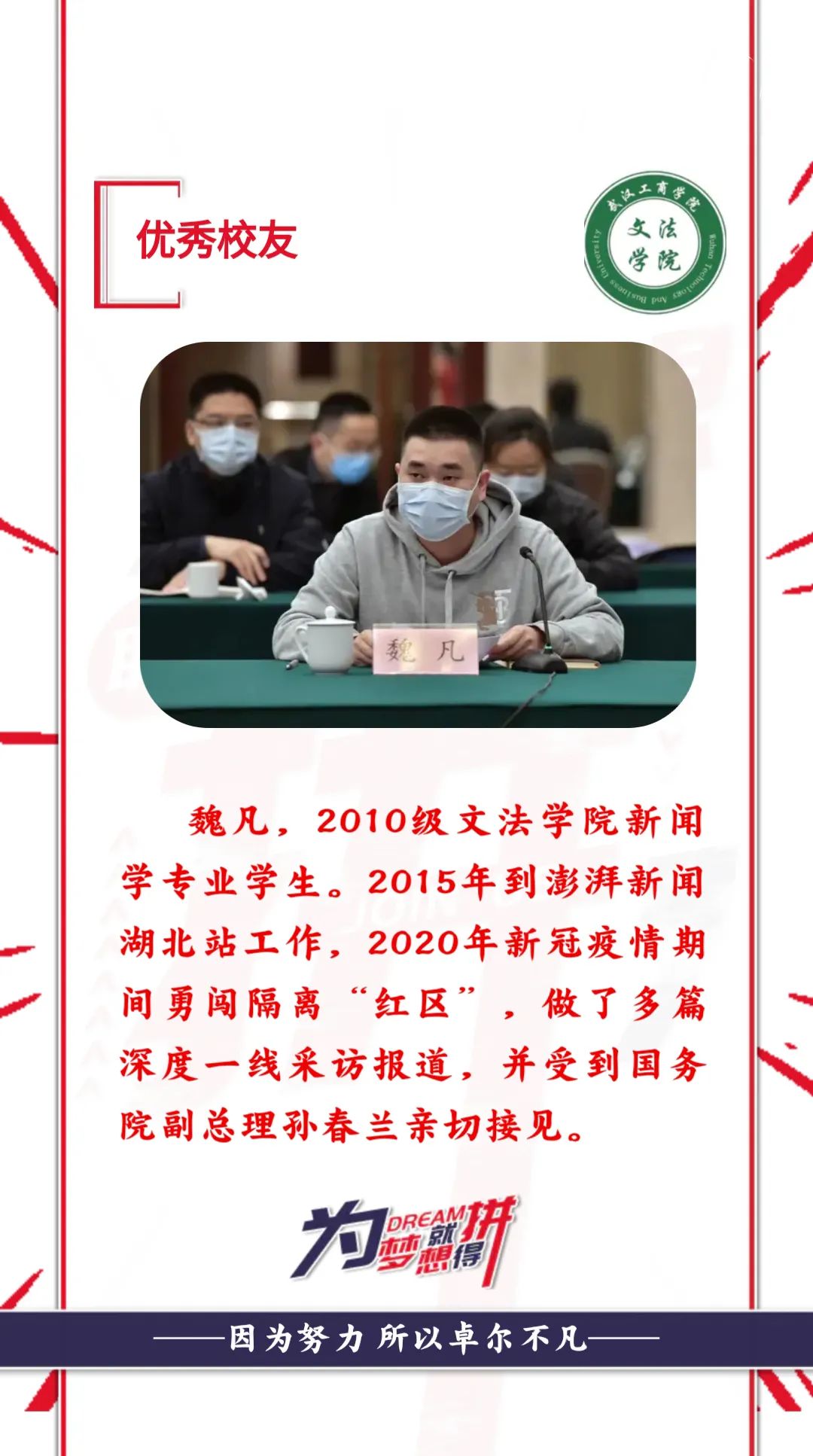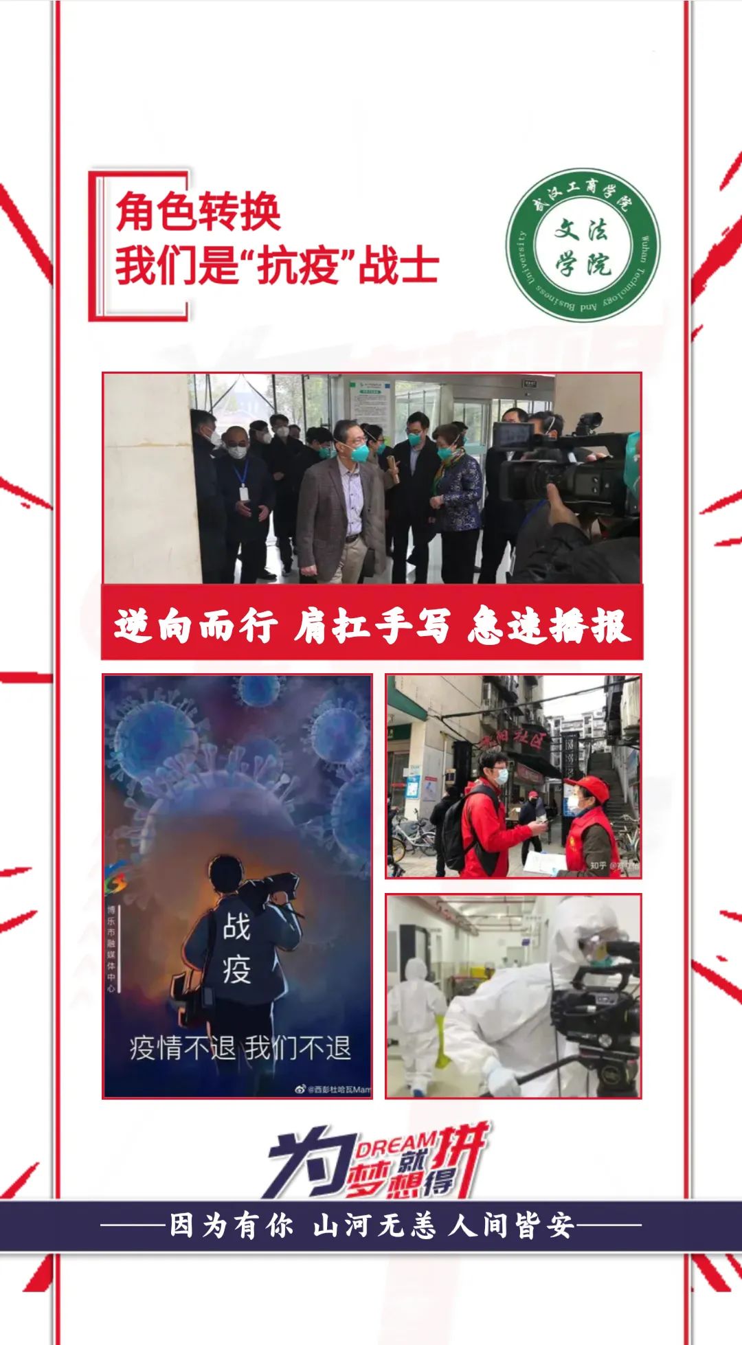 在这场没有硝烟的战“疫”中,必赢优惠y272net新闻专业的师生们众志成城、无畏逆行。用自己的专业素养、家国情怀和奉献精神,为打赢疫情防控攻坚战做出了自己的贡献,涌现出战斗在抗疫一线、被孙春兰副总理点赞的新闻专业校友魏凡;向荆门市第一医院、钟祥人民医院各捐赠一万斤新鲜蔬菜的新闻专业校友张艳华;联合团队募集40余万元善款、登上《中国教育报》头版的新闻专业学生杨泽晗;积极参与线上志愿工作,对疫区提供心理咨询和倾听陪伴服务的新闻专业学生张滨淏;组建社区志愿者服务团队,解决300户居民生活物资问题的新闻系主任毛毅……