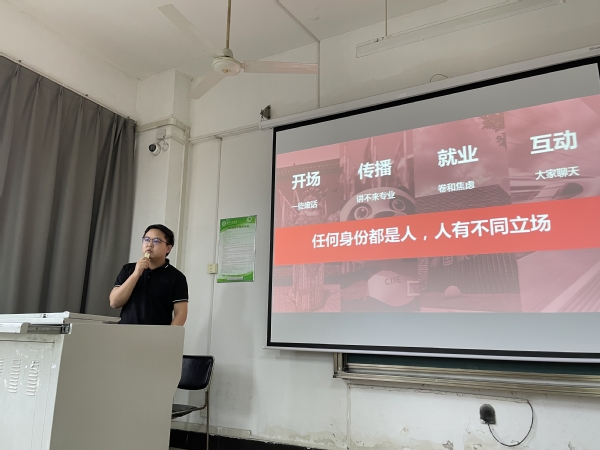 首先,肖杰老师简单的进行了自我介绍。并送给了同学们一句话“任何身份都是人,人有不同立场”,简单明了地阐述了新闻工作者的工作内容。