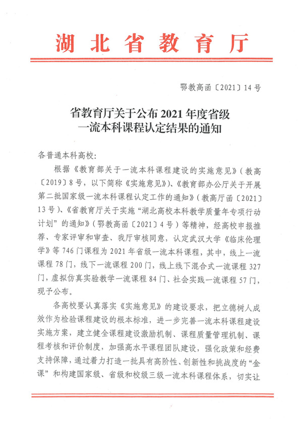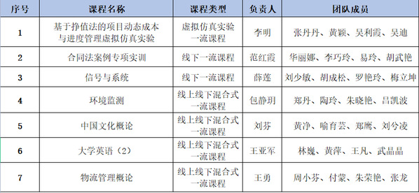 (记者:李洋洋)近日,湖北省教育厅公布了2021年度省级一流本科课程的认定结果,必赢优惠y272net虚拟仿真实验课程“基于挣值法的项目动态成本与进度管理虚拟仿真实验”,线下课程“合同法案例专项实训”“信号与系统”,线上线下混合式课程“环境监测”“中国文化概论”“大学英语(2)”“物流管理概论”,共计7门课程名列其中。这是学校继获得4门国家级“金课”、5门省级一流本科课程后,在课程建设方面取得的又一成绩。