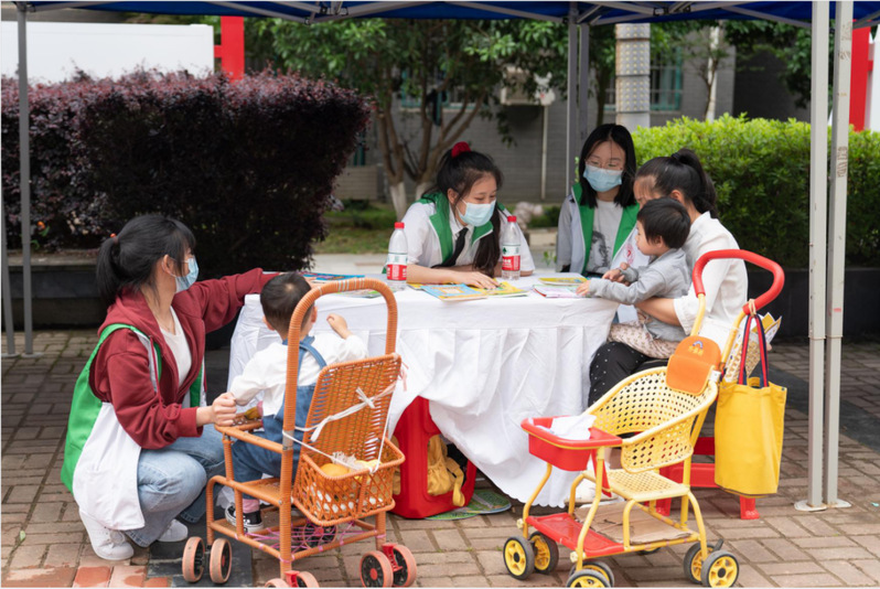 为居民量血压,白杨和刘晓彤和湖北经济学院青年志愿者协会会长共同负责的“量血压”板块,赢得了居民的广泛参与,社区居民张阿姨非常感谢大学生志愿者们走进社区,为居民献爱心。