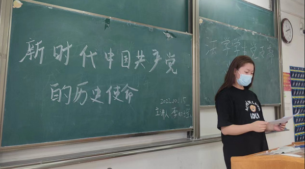 法学学生党支部(记者:杨欣然)2022年10月15日下午14点文法学院学生党支部在综合楼201展开了以“新时代中国共产党的历史使命”为主题的党课。本次党课由法学学生党支部组织委员李虹瑶主持,文法学院法学学生党支部党员、预备党员参加此次会议。