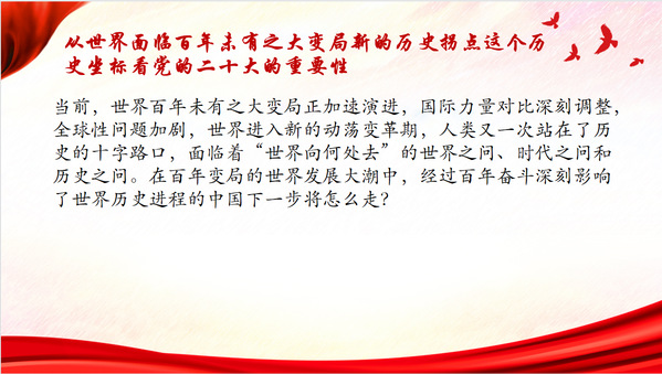 主持人分别从我国处于建设中国特色社会主义现代化阶段新的历史交汇点、走过百年奋斗历程的中国共产党迈上新的历史征程的新起点、世界面临百年未有之大变局新的历史拐点这三个不同的历史坐标带大家看党的二十大的重要性。