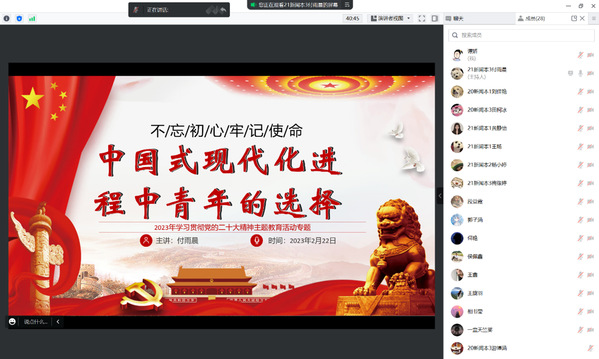 本次会议上,付雨晨结合百年党史,用三个章节向我们详细阐述了中国式现代化道路上新时代青年的使命担当,以视频的形式让我们了解中国式现代化道路的百年探索,并让我们深刻认识到青年在中国式现代化道路中前进的方向。新时代青年要勇做推进中国式现代化的奋进者、开拓者、奉献者,始终保持昂扬奋进的精神状态,发扬永久奋斗的优良传统,在劈波斩浪中开拓前进,用奋斗的双桨划动青春之舟驶向瑰丽彼岸,让青春在全面建设社会主义现代化国家的火热实践中绽放绚丽之花。