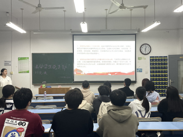 法学学生党支部(记者:杨璟)为学习好党的二十大精神、向着新奋斗目标出发,2023年3月22日,文法学院法学学生党支部开展了以“学习党的二十大精神”为主题的党课。本次党课由来自法学学生党支部的夏双飞主持,文法学院法学学生党支部全体党员参加本次会议。